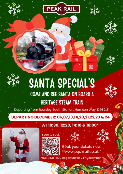 Santa and his Railway Helpers invite you to get Christmas off to a magical start by riding Santa’s festive steam train, through the delightful Derbyshire countryside. Join them on their special train at Peak Rail from Rowsley South Station.