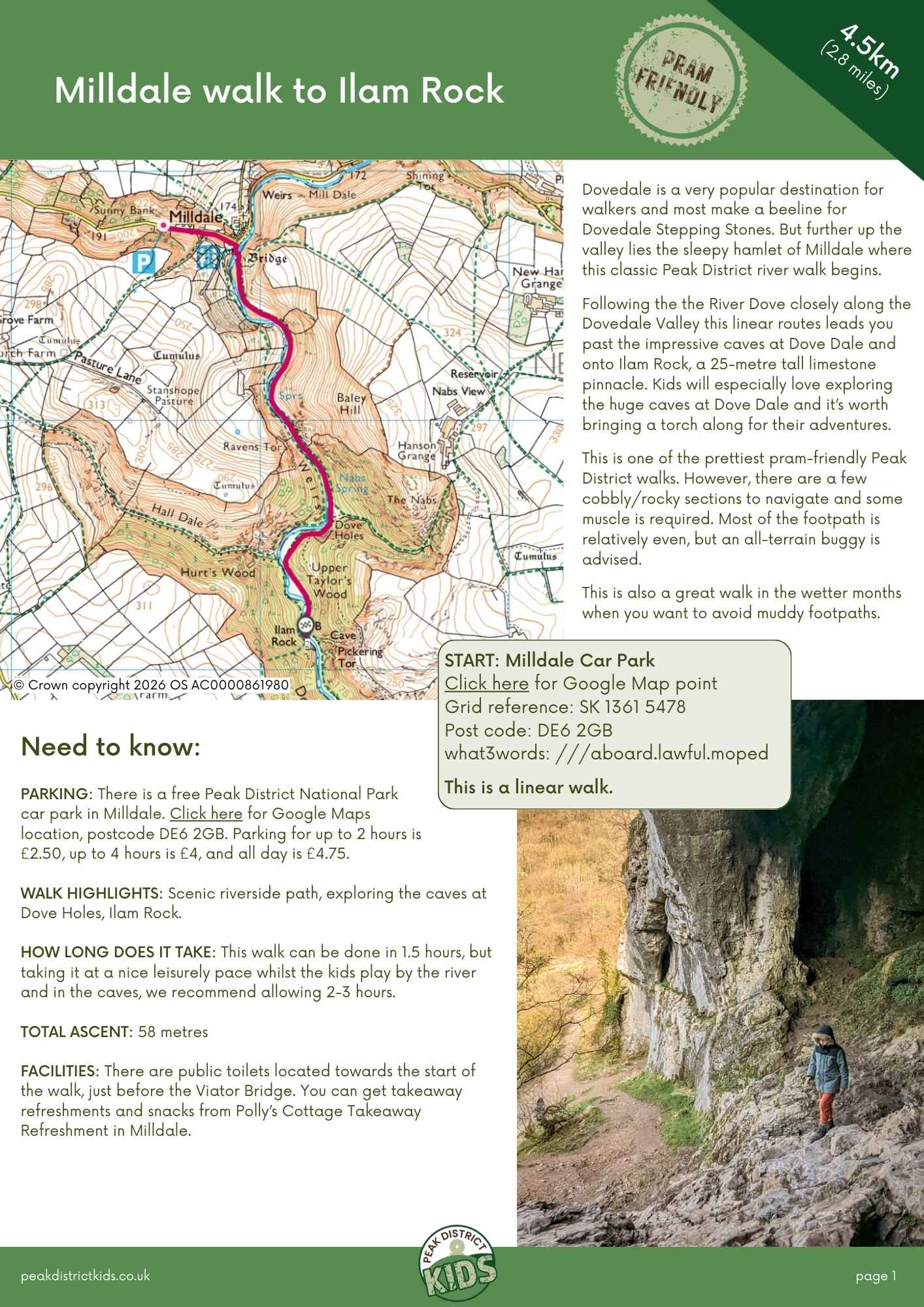 Download a printable guide of the Peak District Kids Milldale walk to Ilam Rock (4.5km, linear). This means you don’t have to rely on your phone for our step-by-step directions, and you can give the kids a copy to follow the route too! You can also use it as a PDF offline version on your mobile device.